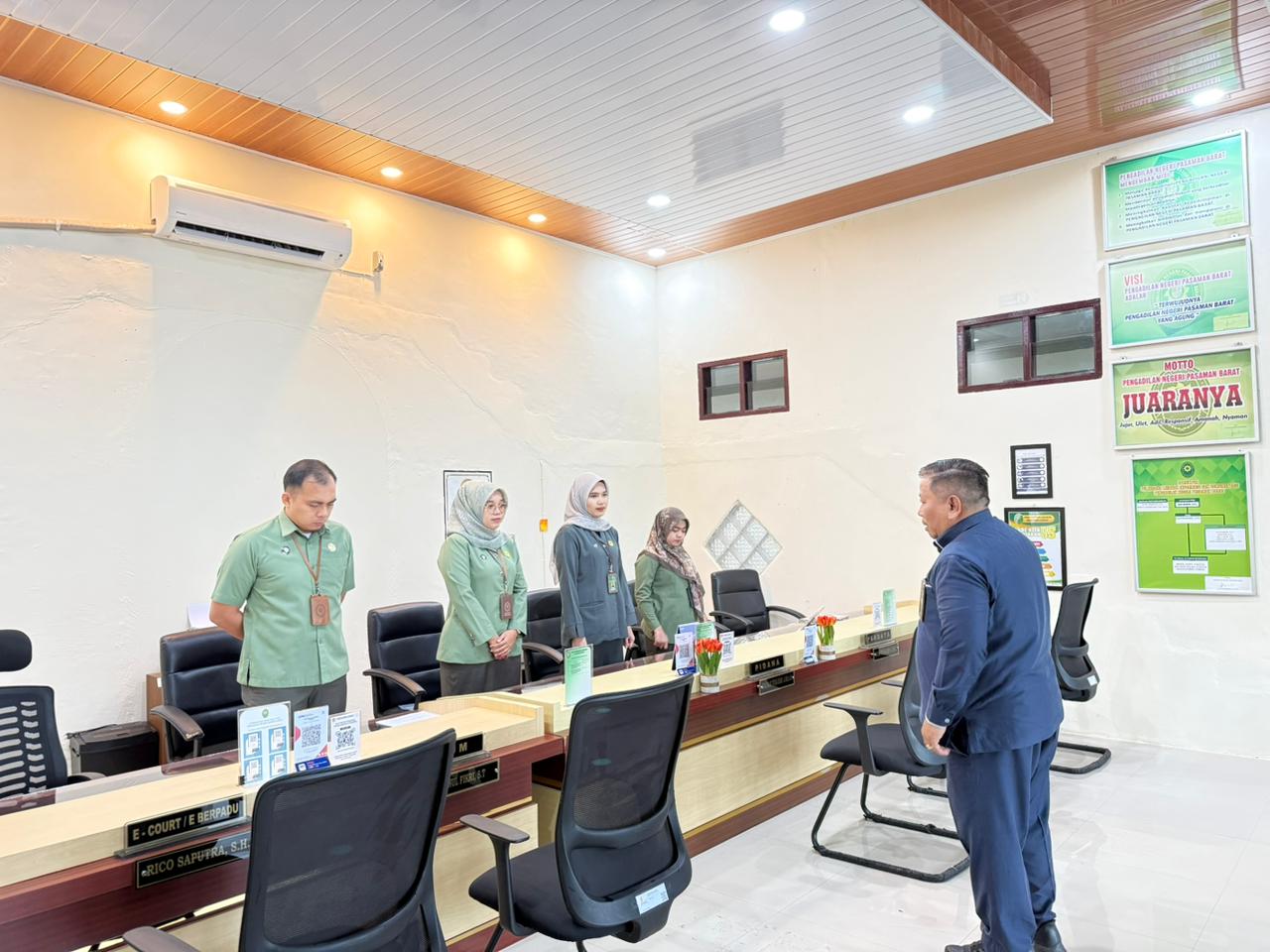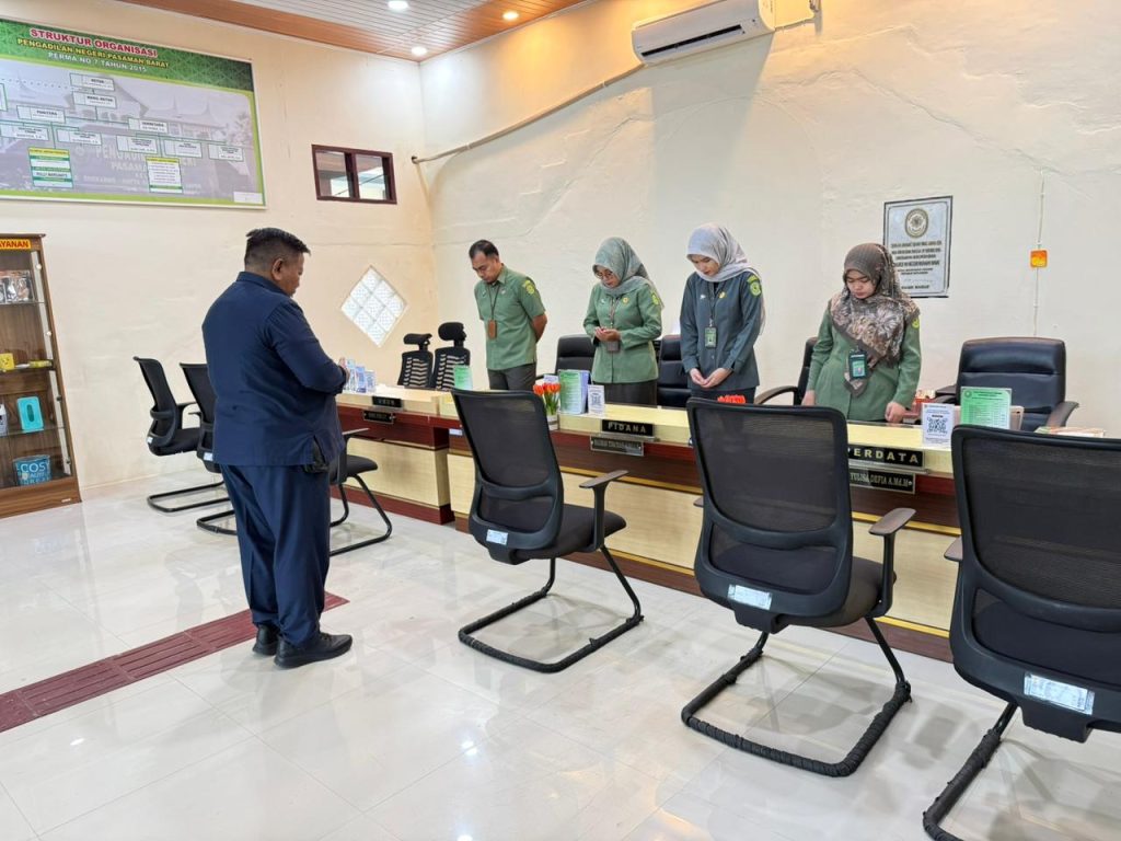 Kegiatan briefing Petugas Pelayanan Terpadu Satu Pintu (PTSP) Pengadilan Negeri Pasaman Barat yang dilaksanakan pada hari Selasa, 10 Februari 2026, dipimpin oleh Panitera Muda Perdata, Bapak Syafrimon, S.H.